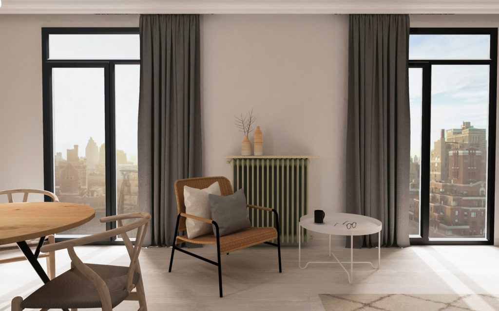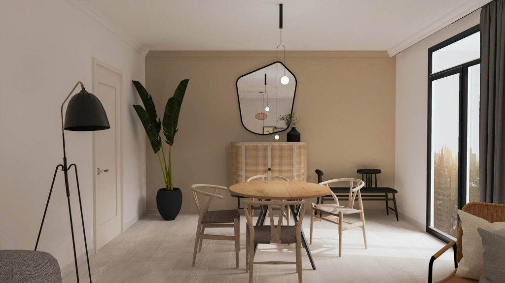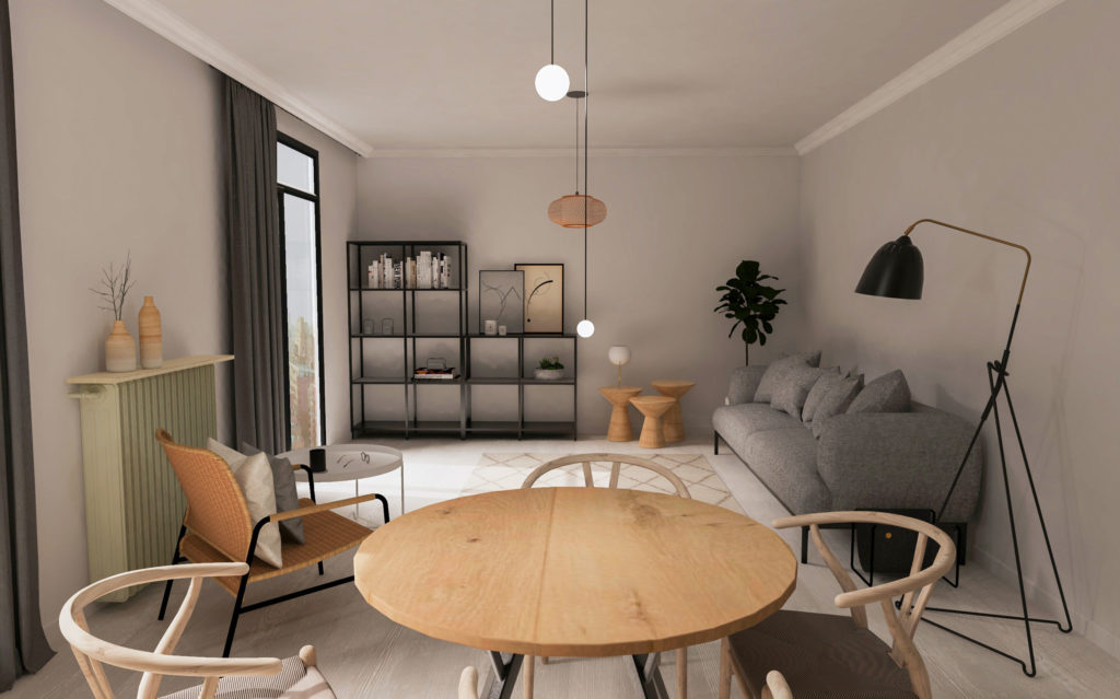 İskandinav tarzda tasarlanmış, doğal malzemeler kullanılmış salon ve yemek alanı tasarım ve görselleştirme çalışması.